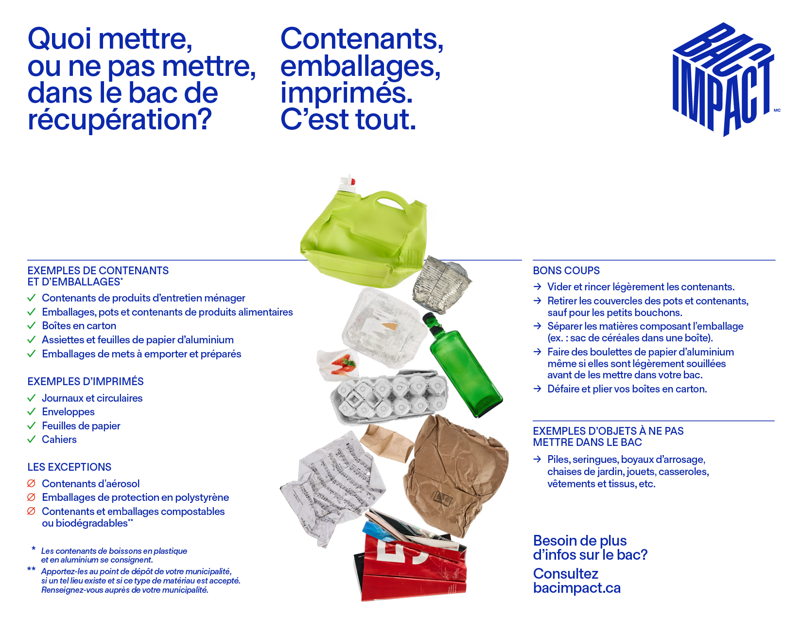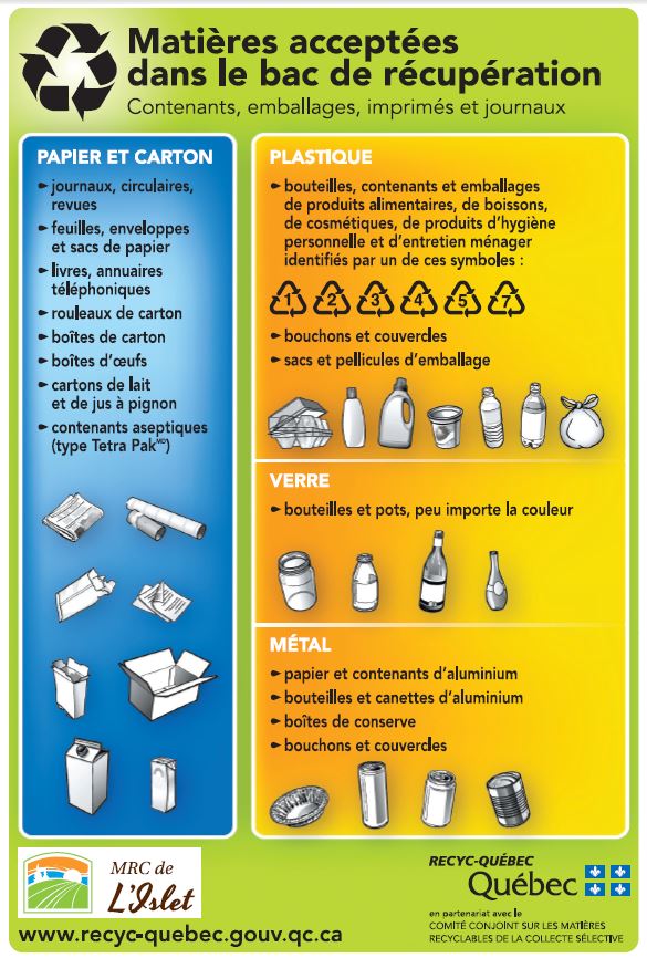 Pour la collecte des ordures et la récupération, veuillez consulter le calendrier. En tout temps, nous recyclons les piles et les téléphones cellulaires au bureau municipal. Pour le recyclage de la peinture et des textiles, il y a des bacs au garage municipal à cet effet. Voici le lien pour localiser les points de dépôts de peinture : https://www.ecopeinture.ca/localiser/ Il est maintenant possible de récupérer les lampes au mercure, les fluocompactes, les tubes fluorescents et les ampoules DHI au bureau municipal. La liste des matières acceptées à la récupération